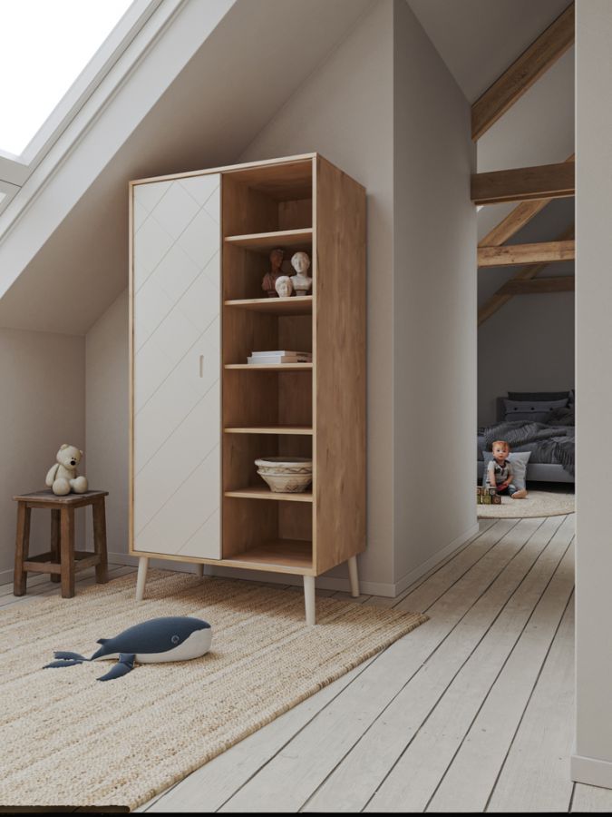 Šatní skříň s posuvnými dveřmi je výbornou volbou. Na začátku se do ní vejdou všechny potřebné věci. Dá se skvěle doplnit s ostatními prvky nábytkové řady. Vznikne tak dětský pokoj, který děti nikdy neomrzí. Vnitřní část skříně lze podle potřeby přestavět na závěsnou nebo policovou verzi. V případě potřeby je navíc možné doobjednat police navíc. Přední část výrobku je vyrobena z lakované MDF s hedvábným leskem, zatímco korpus nábytku je vyroben z dřevotřísky s dezénem Natur Calobra.