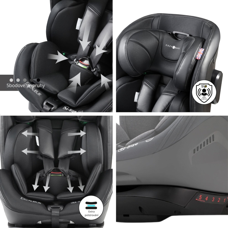 Autosedačka Cozy N Safe Excalibur i-Size 76–150 cm Hlavní vlastnosti První i-Size autosedačka schválená podle švédské normy E5 Unikátní prodloužený 5bodový pás do 125 cm (cca 6 let) 5 poloh sklonu schválených pro všechny fáze používání Podpěrný klín pro snadné přizpůsobení většině autosedaček Nastavitelná opěrka hlavy ve 13 polohách Ochrana proti bočnímu nárazu Vložka pro batolata součástí balení Extra polstrování Prodyšné materiály pro lepší cirkulaci vzduchu Vysoce kvalitní vstřikované plasty Specifikace Věkové určení: cca 15 měsíců – 12 let Výška dítěte: 76–150 cm Hmotnost produktu: 11 kg Rozměry: V63 × Š42,5 × H52 cm Instalace: ISOFIX, horní úchyt (Top Tether) a/nebo 3bodový pás vozidla Norma: ECE R129 (i-Size)