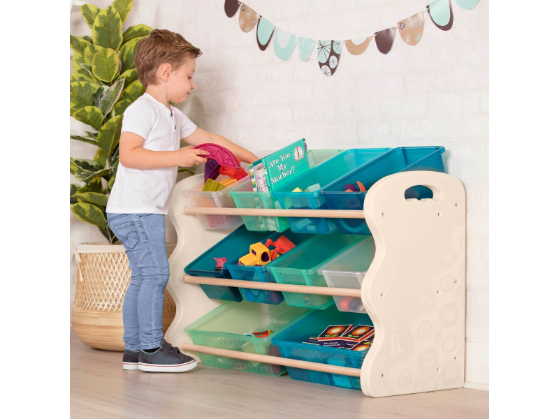 Stylový organizér na deset plastových boxů zjednoduší a zpříjemní vašim dětem každodenní úklid hraček, výtvarných potřeb apod. Boxy ze stojanu snadno vyjmete, takže pro hraní i uklízení si je vždy můžete odnést, kam potřebujete. Dvě velikosti boxů umožňují přehledné ukládání drobnějších i větších předmětů. Otvory na bočních stěnách organizéru usnadňují jeho uchopení a snadné přemístění.