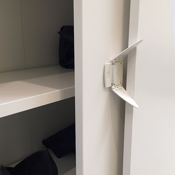 Tento praktický bezpečnostní uzávěr slouží proti otevření posuvných dveří skříní. Upevňují se lepící páskou, obsaženou v balení . Balení obsahuje 1ks.