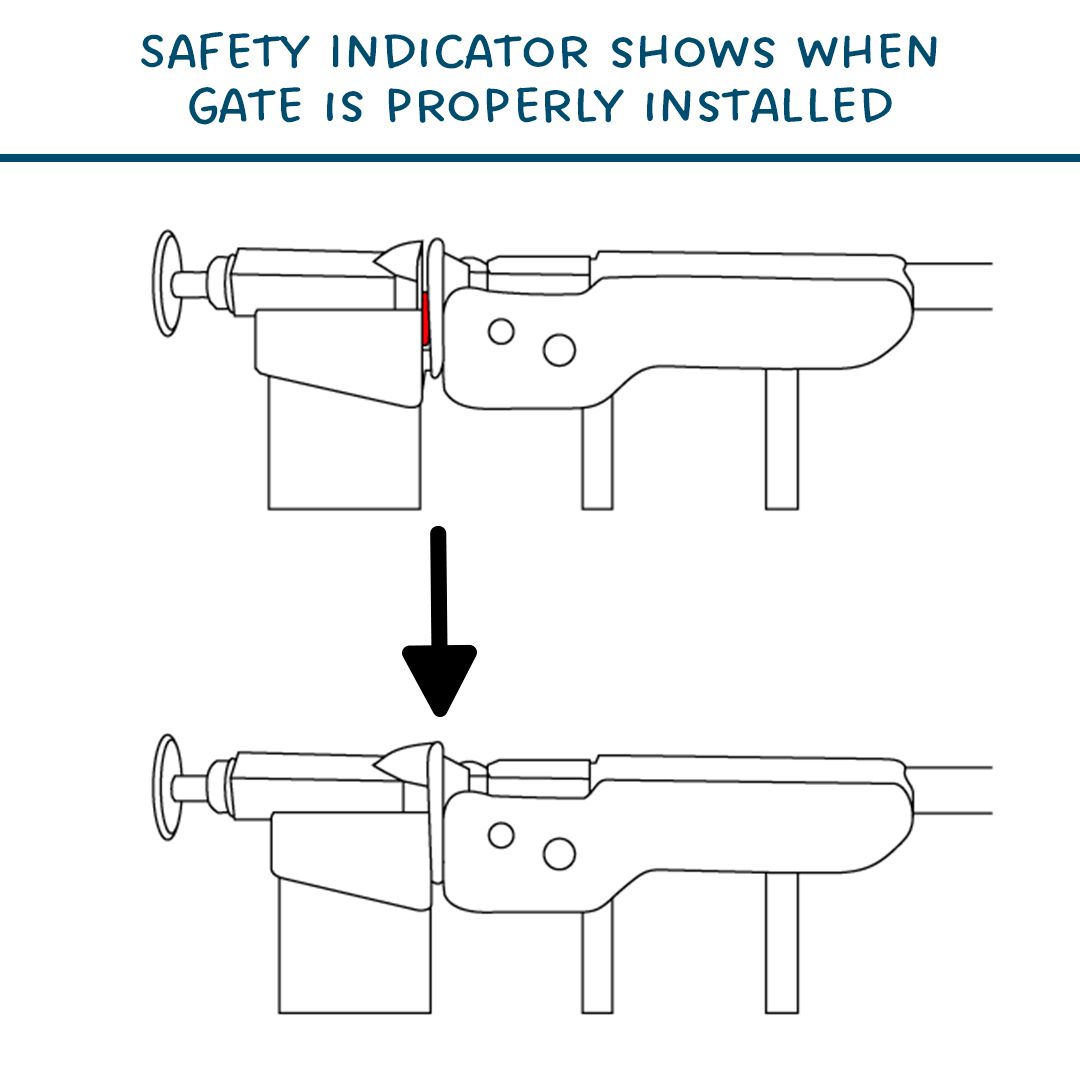 Třístupňový bezpečnostní indikátor tlaku ukazuje, zda nastavení šroubů a tuhost stěn při instalaci zajišťují bezpečnost. Tato zábrana se upevňuje tlakově a může být snadno namontována bez použití jakéhokoli nářadí. Prodloužení je možné použít na obě strany zábrany.