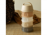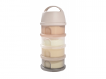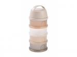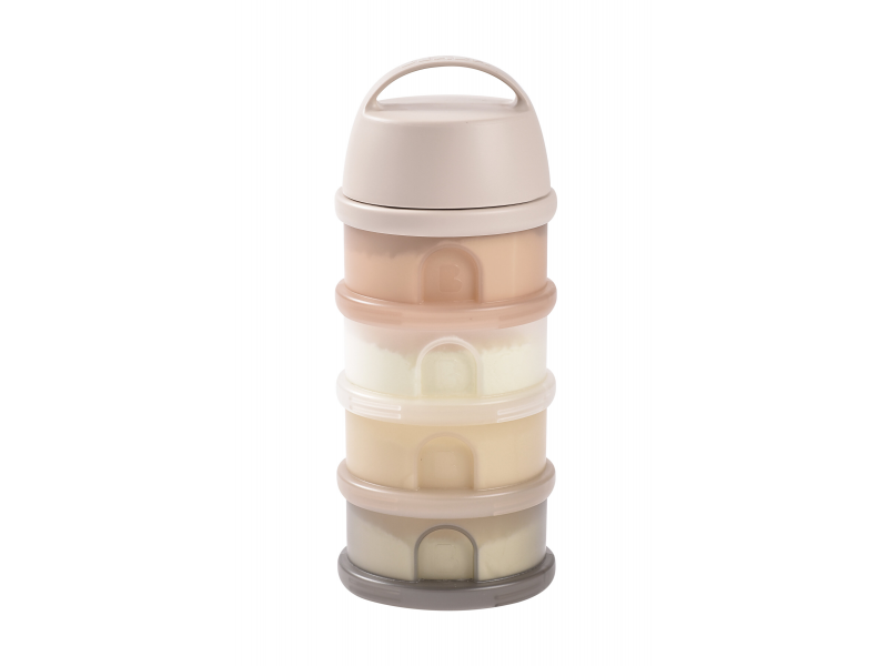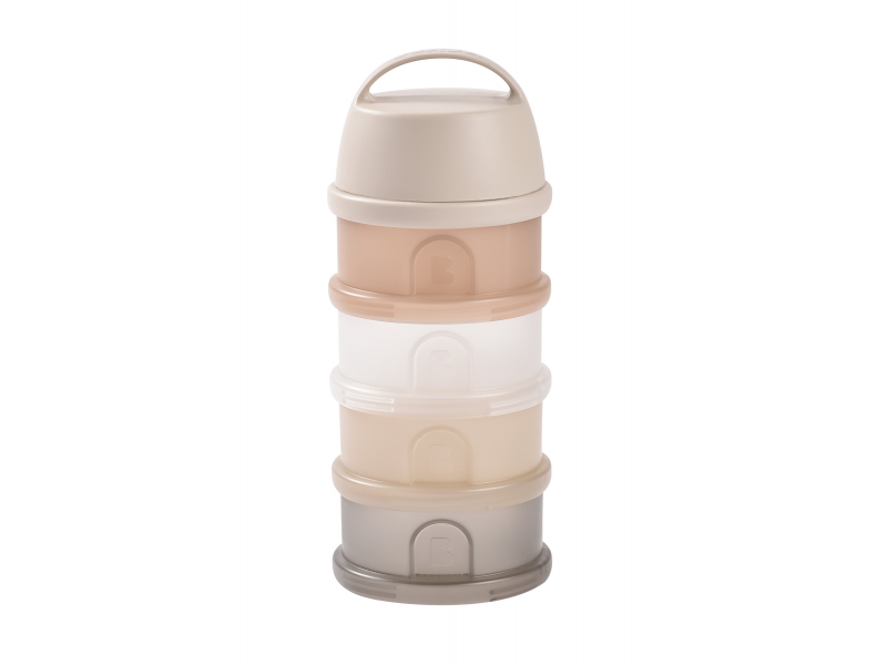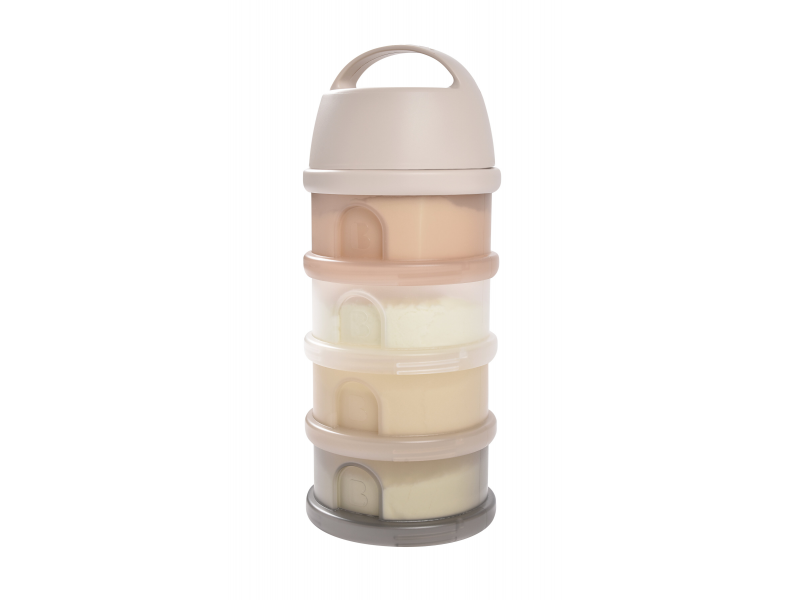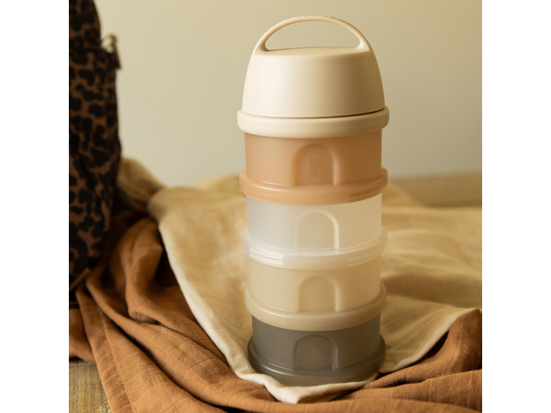 Čtyři kompaktní dávkovače jsou propojené šroubovacím závitem, násypné víčko a ochranné víčko je rovněž šroubovací. Sušené mléko je hygienicky uložené, stačí jen nasypat s pomocí násypného víčka do jakékoli kojenecké láhve bez rizika rozsypání. Průhledný materiál umožňuje snadnou kontrolu obsahu kelímků.