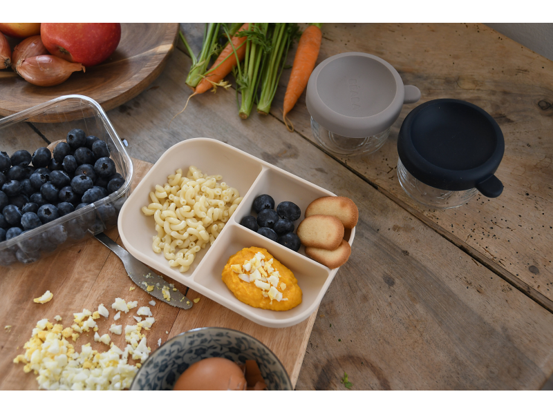 Talíř s přísavkou z vysoce kvalitního silikonu umožňuje uchycení ke stolu nebo pultu jídelní židličky. Ergonomický tvar usnadňuje nabírání příkrmu. Tři přihrádky umožňují oddělené servírování jednotlivých součástí dětského pokrmu.