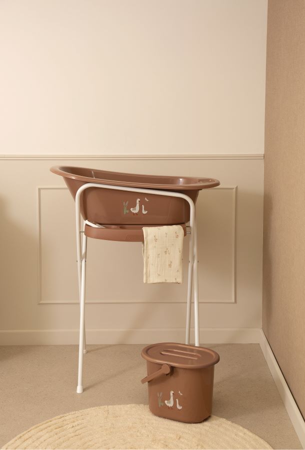 Koupání miminka patří k nejoblíbenějším večerním rituálům. Pokud máte stojan nemusí se nutně odehrávat v koupelně. Někdy se pěkně protáhne a tak je důležitá správná výška vaničky pro správné držení těla a také mít všechno na dosah a nemuset od koupaného dítěte odcházet. Stojan Click od Bébé-jou je proto vybaven integrovaným držákem ručníku nebo župánku a místem pro položení mýdla nebo koupacích gelů a šampónů. Nikdy nenechávejte dítě při koupání bez dozoru.