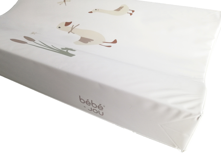 Přebalovací podložka Bébé-jou má pohodlnou velikost. Je vyrobena z vysoce kvalitní polyetherové PU pěny s dlouhou životností. Tyto speciální vlastnosti zaručují, že je hlavička i krček dítěte obzvlášť dobře podepřen. Zaoblený tvar zajistí, že dítě leží pohodlně a bezpečné ve středu. Fólie a prodyšná pěna jsou vyrobeny z ekologicky šetrných materiálů a jsou bez škodlivých látek (Ftalátů). Certifikované Oeko Tex.