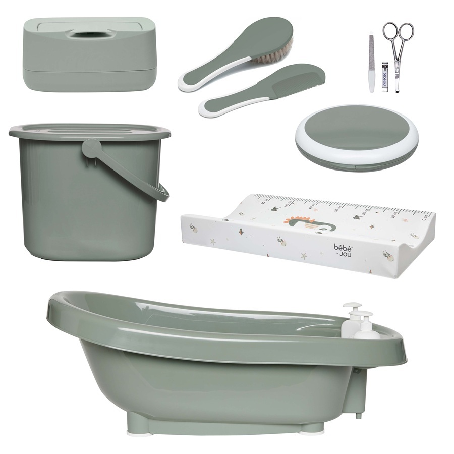 Kompletní koupací termo-set Bébé-jou, který obsahuje vše, co potřebujete ke koupání a péči o miminko. Výrobky jsou designově sladěné. Zvýhodněná cena.