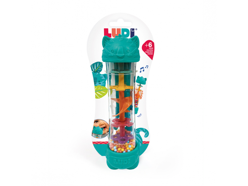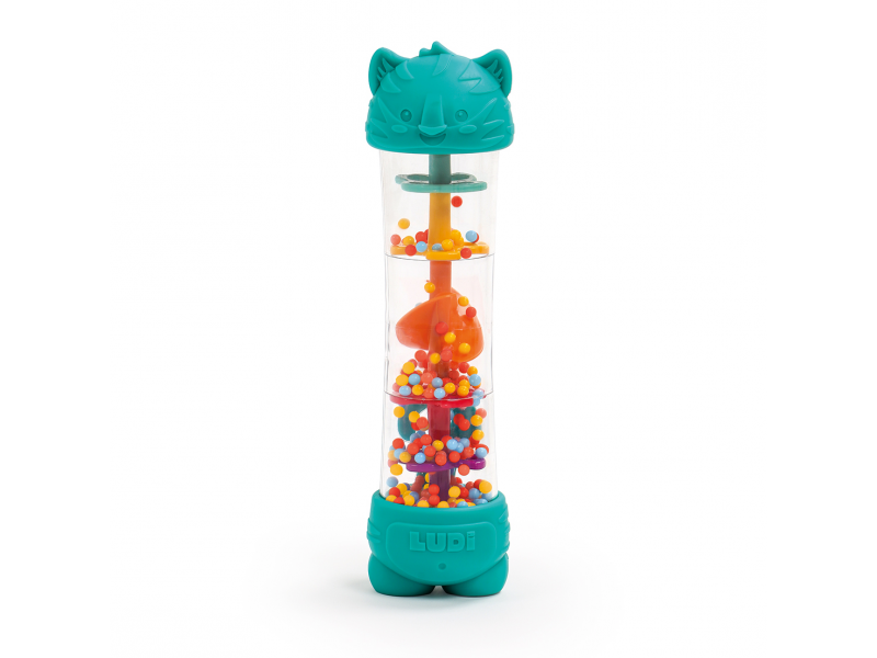 Chrastítko s korálky dešťová hůlka je senzorická hračka pro děti od 6 měsíců, která kombinuje jemný uklidňující zvuk, vizuální zábavu i kousátko pro období růstu zoubků. V průhledném tubusu se při otáčení hračky pomalu přesýpají barevné kuličky a vytváří příjemný uklidňující „dešťový“ zvuk. Dítě zároveň vidí pohyb kuliček a postupně chápe souvislost mezi vlastním pohybem a výsledkem. Zakončení hračky v podobě tygří hlavy a nohou slouží i jako kousátka pro úlevu citlivým dětským dásním při prořezávání prvních zoubků.