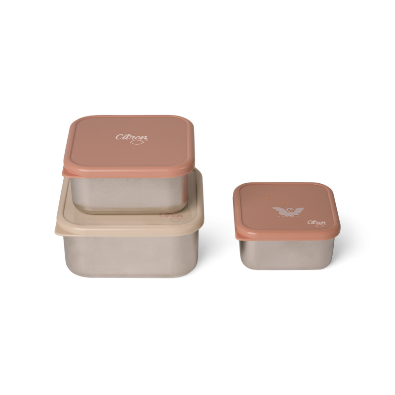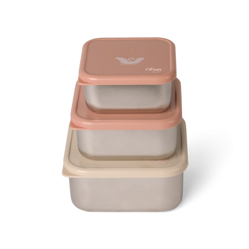 Už žádné plastové nádoby! Naše sada tří nerezových boxů je skvělou alternativou pro uložení svačin, obědů i menších pochoutek. Jsou vhodné jak pro pevné, tak i polotekuté potraviny a díky stohovatelnému designu je snadno uložíte do sebe, čímž ušetříte místo. Ideální na cesty, do školy i do práce!