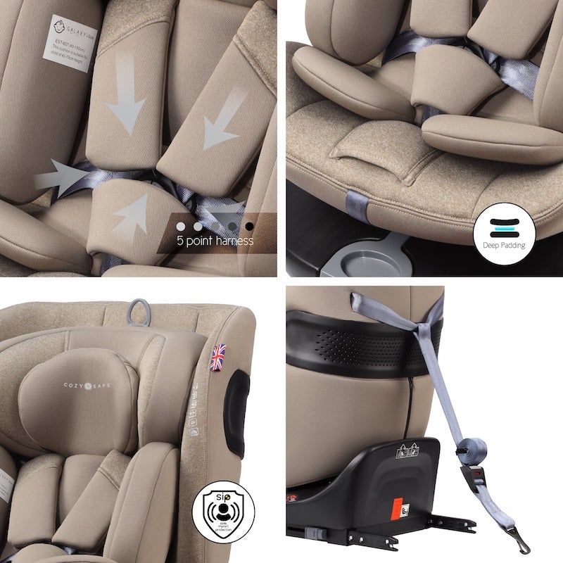Cozy N Safe Galaxy i-Size 360 (40–150 cm s otočnou základnou o 360° a isofixem) Klíčové vlastnosti Certifikace i-Size R129 Unikátní rychlé uvolnění horního pásu: připevnění autosedačky pomocí ISOFIXu a horního pásu. Ochrana proti bočnímu nárazu Hluboké polstrování Vložky pro novorozence a batolata Nastavitelná zádová opěrka Směr jízdy: Proti směru jízdy: vhodné pro děti od 40 do 105 cm / Po směru jízdy: vhodné pro děti od 76 do 150 cm Metoda instalace: ISOFIX s horním pásem (top tether) / Tříbodový bezpečnostní pás vozidla Nastavitelná opěrka hlavy Nastavitelné sklopení Rozměry: Výškový/věkový rozsah: 40–150 cm Rozměry autosedačky: 46 cm × 48 cm × 63 cm Rozměry balení: 64 cm × 53 cm × 45 cm Váha: Váha produktu: 13,0 kg Váha produktu v balení: 13,8 kg