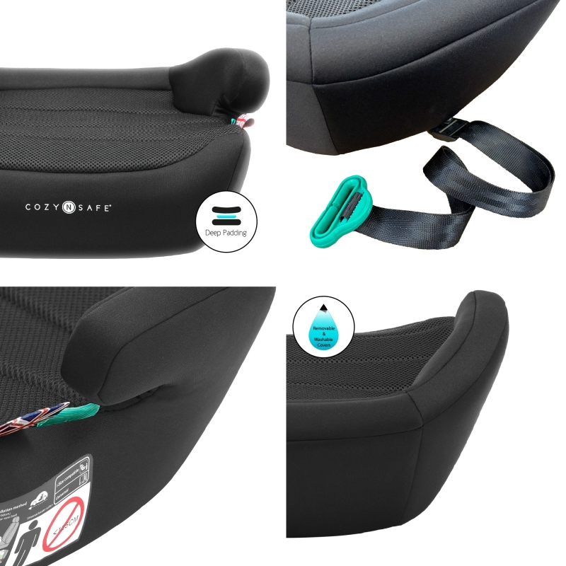 Podsedák Cozy N Safe Neo+ i-Size 125–150 cm s nastavitelným popruhem Hlavní vlastnosti instalace po směru jízdy integrovaný vodič pásu Pohodlné opěrky rukou Snímatelné potahy Extra pěnové polstrování sedáku Snadná instalace pomocí 3bodového pásu vozidla Specifikace Věk dítěte: přibližně 6–12 let Výška dítěte: 125–150 cm Hmotnost autosedačky: 1 kg Rozměry: V 18 cm × Š 46 cm × H 34 cm Instalace: Po směru jízdy, pomocí 3bodového bezpečnostního pásu Certifikace: ECE R129 (i-Size)