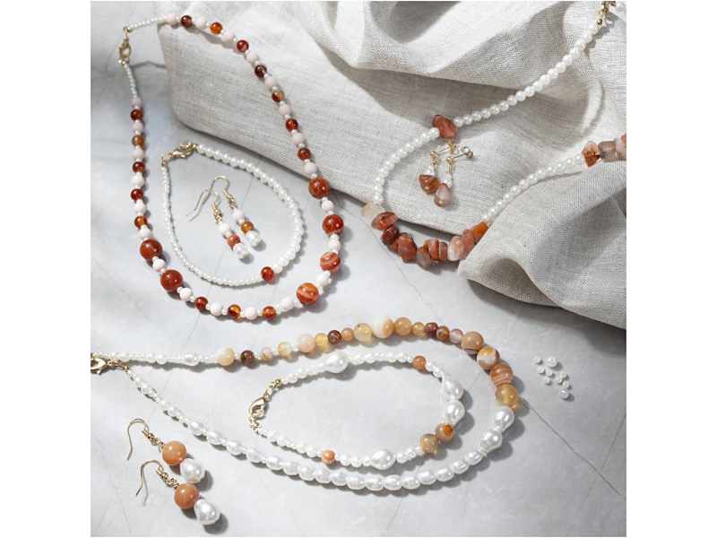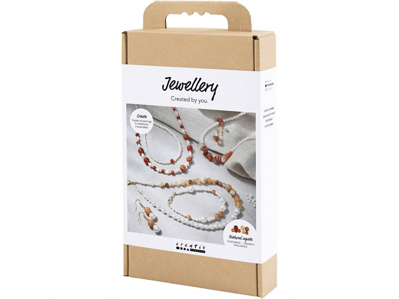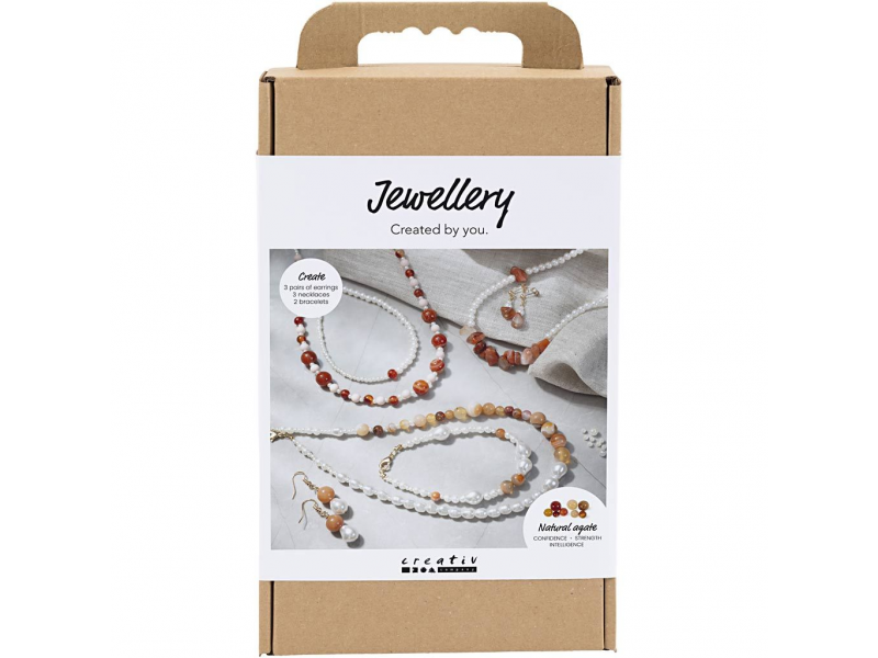 Originální kreativní sada pro výrobu šperků z achátu a jantaru. Umožní vám vytvořit působivé šperky s polodrahokamem achát – s krásnou kresbou, jemnými odstíny a výraznou osobitostí. V balení najdete materiál pro výrobu jednoho náhrdelníku, jednoho náramku a páru náušnic, včetně návodu. Achát je oblíbený pro svůj vrstevnatý vzhled a symboliku vnitřní rovnováhy, a v kombinaci s perleťově bílými korálky vzniknou elegantní šperky, které působí luxusně a zároveň přirozeně.