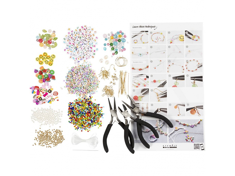 Originální kreativní sada pro výrobu šperků z korálků je ideální pro všechny, kteří se chtějí naučit základy šperkaření a zároveň si rovnou vyrobit vlastní kolekci doplňků. V krabičce najdete bohatý výběr korálků a komponentů, nářadí i návod. Po naskenování QR kódu se dostanete do výukového světa videí, která vás provedou základními technikami krok za krokem. Na konci budete umět několik klíčových postupů a vytvoříte si 4 páry náušnic a přibližně 20–25 šperků na elastické šňůrce (náramky, prstýnky nebo náhrdelníky) v hravých barvách.