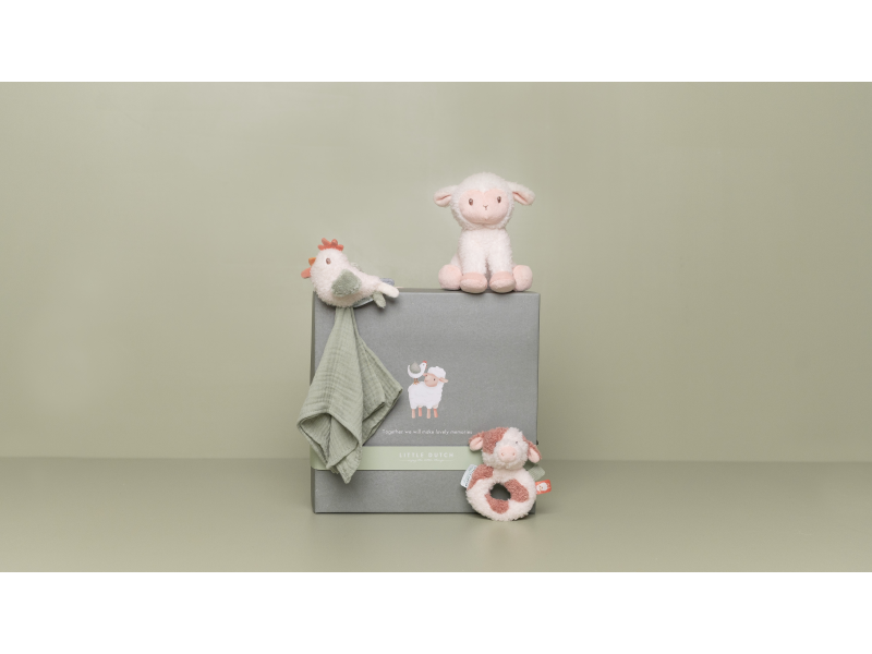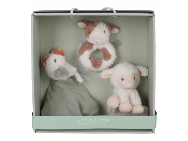 Krásná dárková sada plyšových hraček je ideální jako dárek pro novorozené miminko. Sada obsahuje chrastítko v podobě kravičky, muchláčka se slepičkou a plyšovou ovečku.