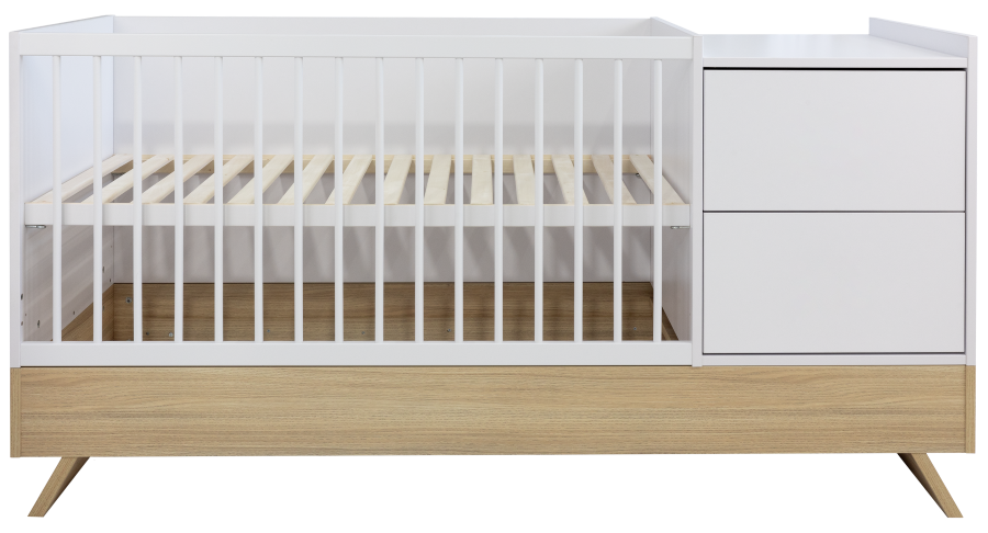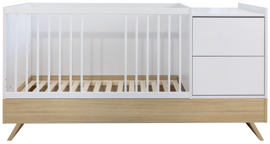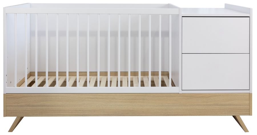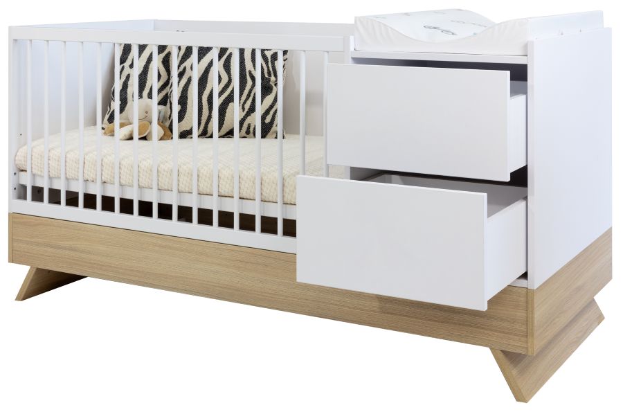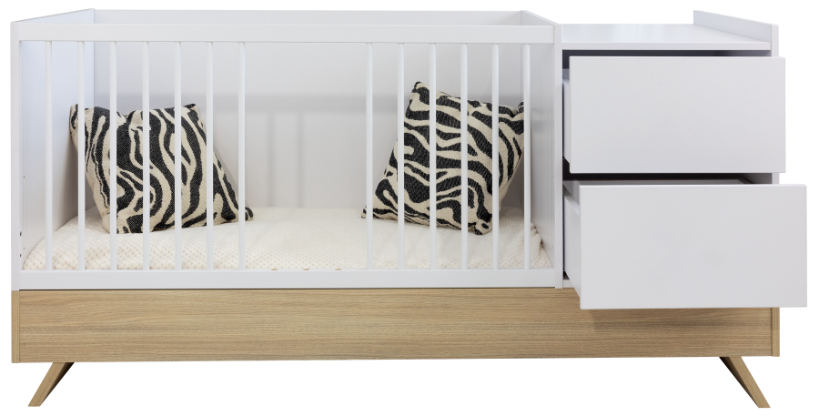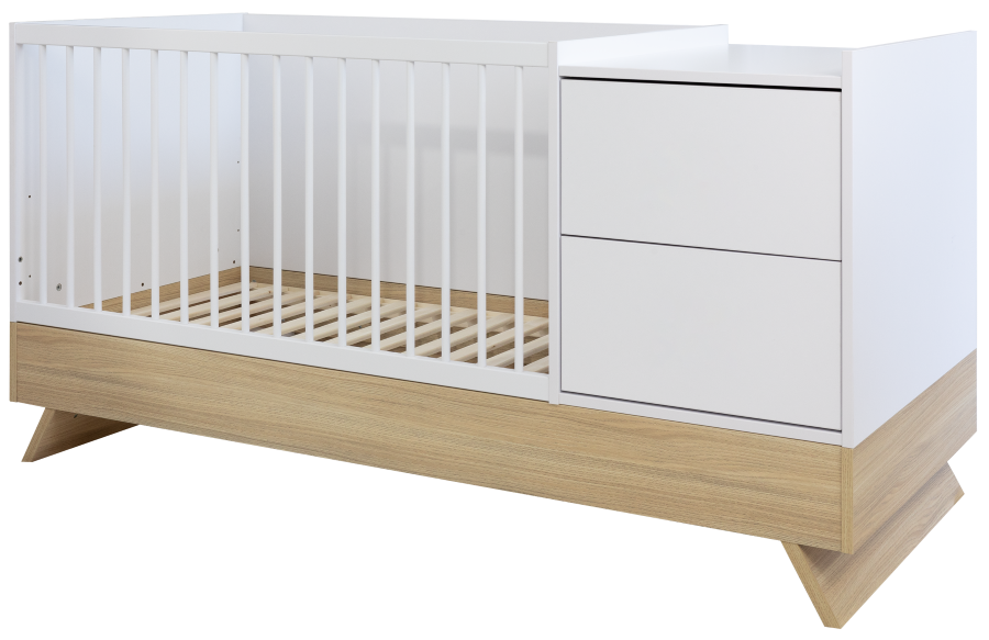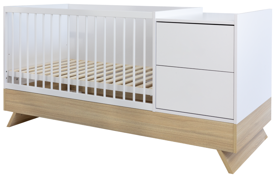 Nejnovější člen kolekce Sienna zaujme nejen svým poutavým designem, ale také rafinovanou, promyšlenou funkčností. Tato multifunkční postýlka, která stojí na elegantních nohách z dubového dřeva a je spárována s panelem v bílé barvě, vytváří dokonalou rovnováhu mezi přírodním šarmem a moderním stylem.