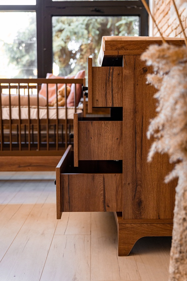 Pokoj pro novorozence se prakticky neobejde bez komody a přebalovacího pultu. Zásuvková komoda Nest Walnut v odstínu tmavého ořechu s černými úchytkami, které dodává nábytku osobitý vzhled, tvoří takový kousek nábytku, který po doplnění o přebalovací nástavec, pokrývá oba tyto požadavky. Je navržena tak, aby se vešla do relativně malého prostoru, a přesto nabídla co největší pomoc novým rodičům.