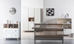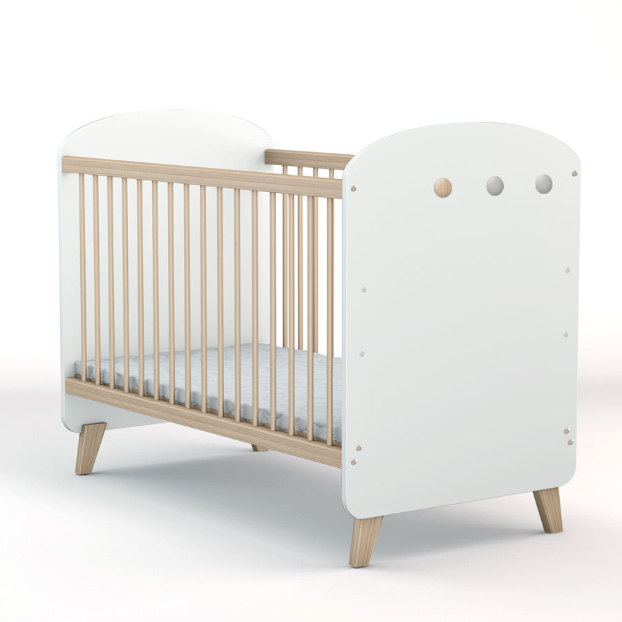 Moderní dětská postýlka s čely vyrobenými z laminované dřevotřísky a s nožičkami, bočnicemi a s roštem z masivu.
