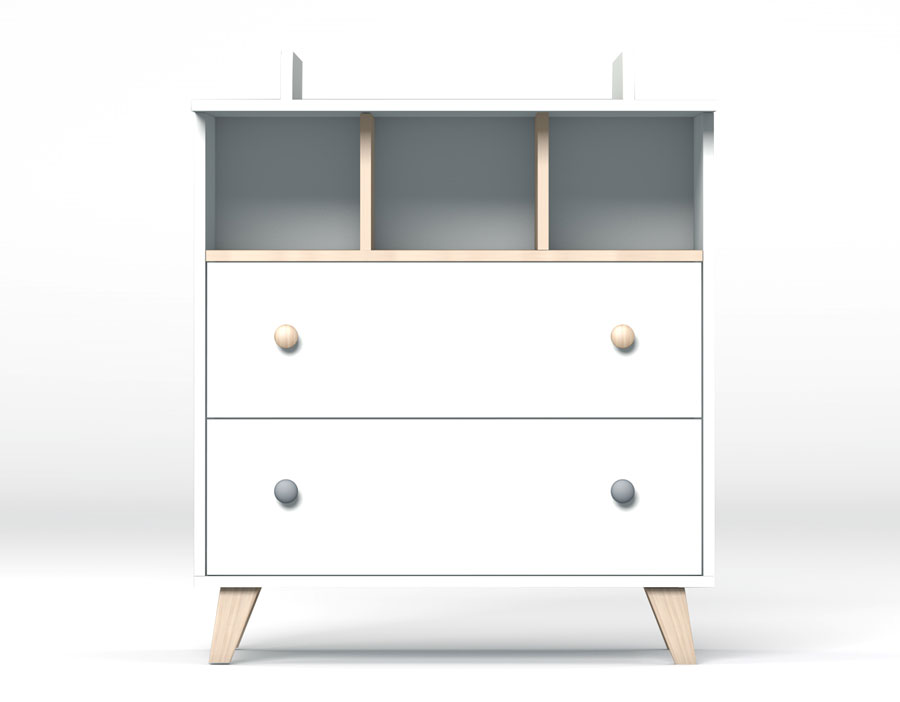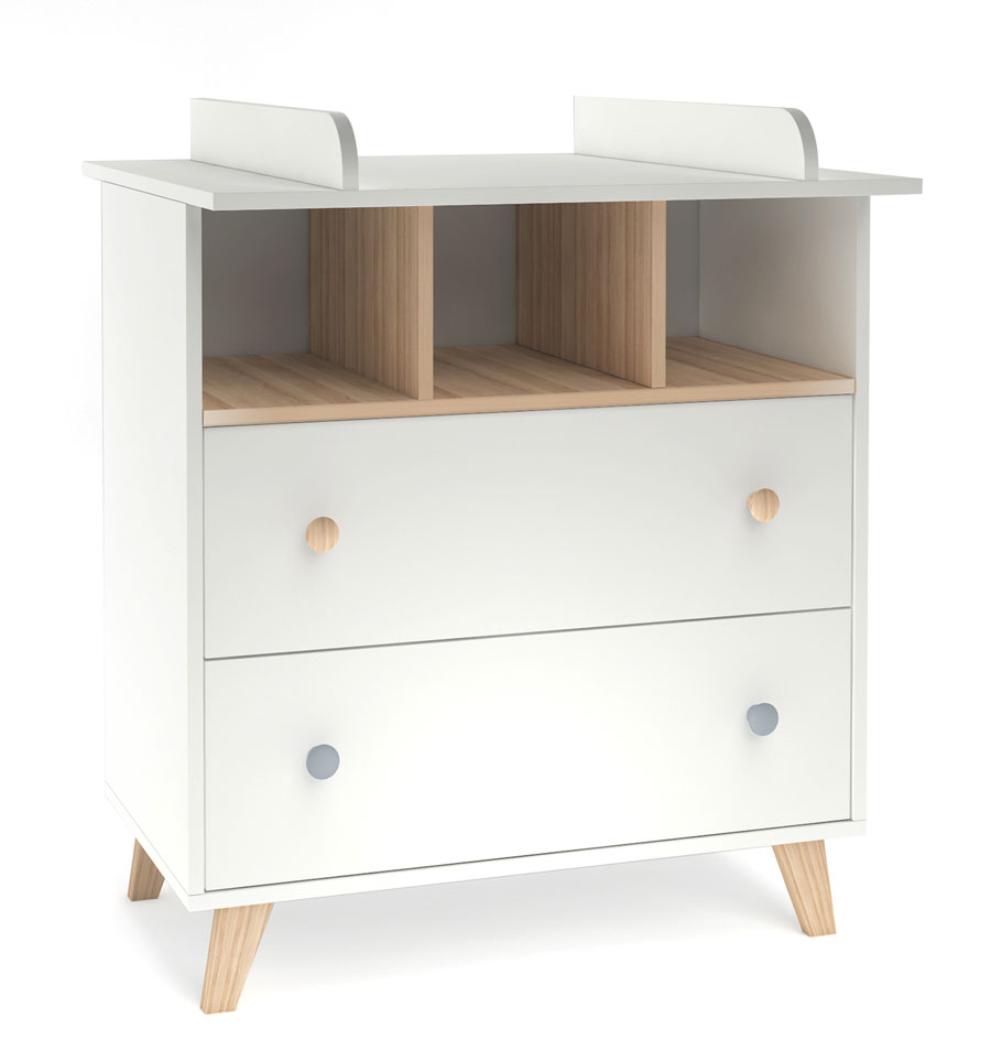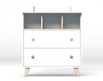 Komoda poskytne dostatek místa na vše potřebné pro Vaše miminko, v horní části otevřená polička pro velmi frekventované potřeby nebo pro věcí, po kterých potřebujete sáhnout ospalá poslepa, níže dva šuplíky chránící věci před prachem. Komoda je optimálně vysoká pro pohodlné přebalování. Součástí dodávky je přebalovací nástavec, který později můžete odmontovat a komodu dále používat bez něj.