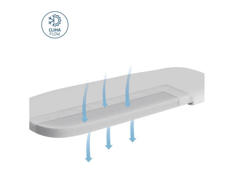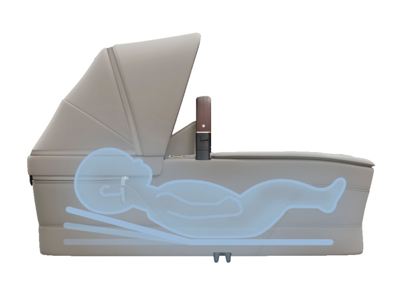 Prostorná korbička je vybavená ClimaFlow ventilačními panely, které pomáhají udržet příjemné klima i v teplejších dnech. Ochranu před sluncem zajišťuje velká prodlužovací stříška s UPF 50+ a průhledovým ventilačním okénkem. Pohodlí miminku poskytuje oboustranná matrace z paměťové pěny s jednou stranou z jemné 100% organické bavlny a druhou stranou z prodyšné síťoviny pro lepší cirkulaci vzduchu. Funkce SoothingSlope umožňuje matraci lehce vyvýšit v horní části, což může pomoci omezit reflux a podpořit pohodlí při trávení vašeho miminka.
