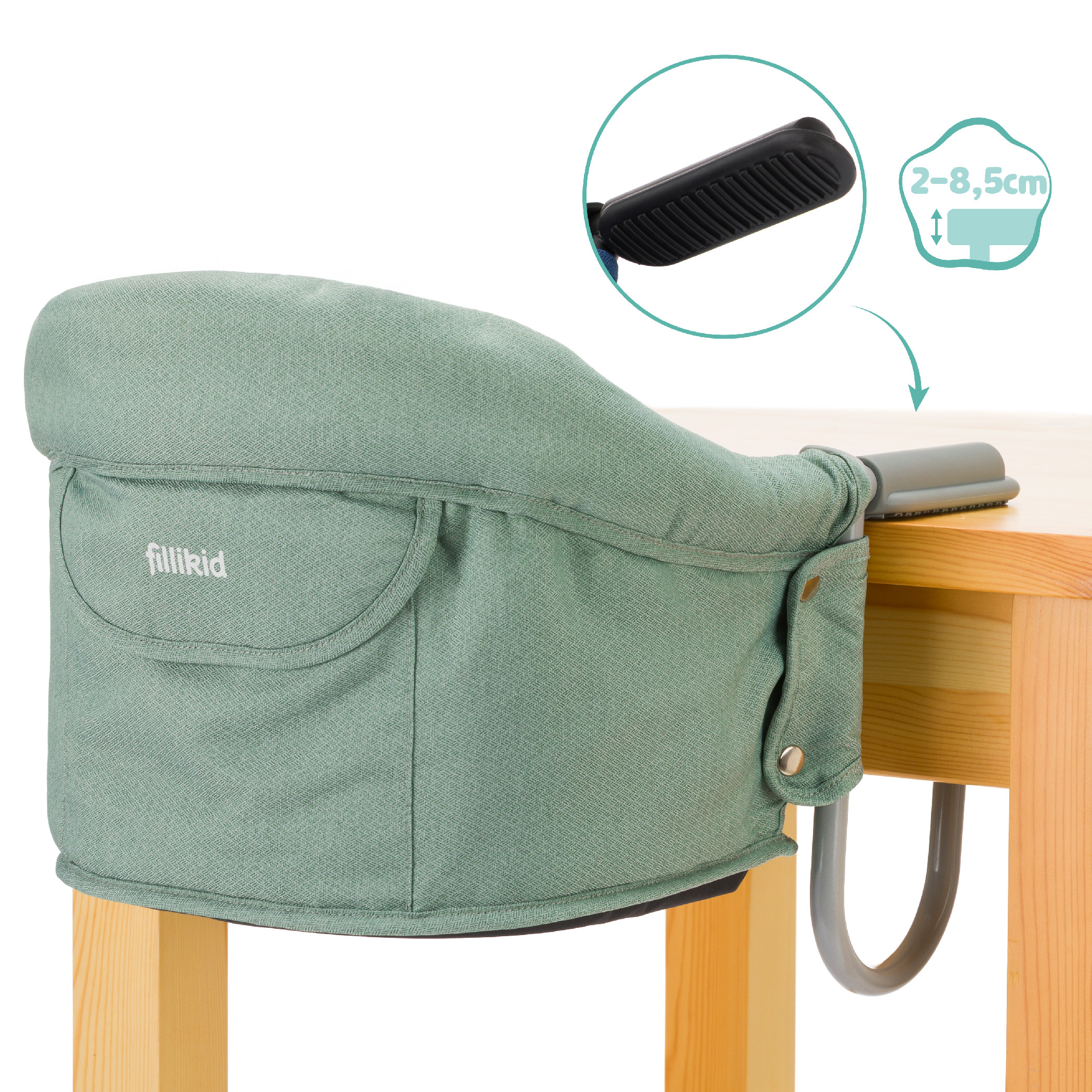 Židli lze jednoduše a bezpečně připevnit k deskám stolů o tloušťce až 8,5 cm. Hodí se pro použití doma, u prarodičů i v restauraci.