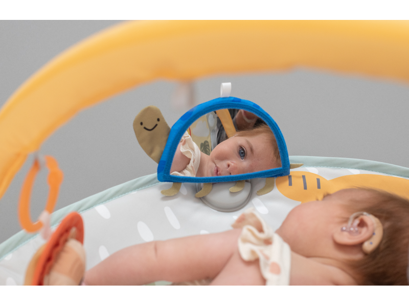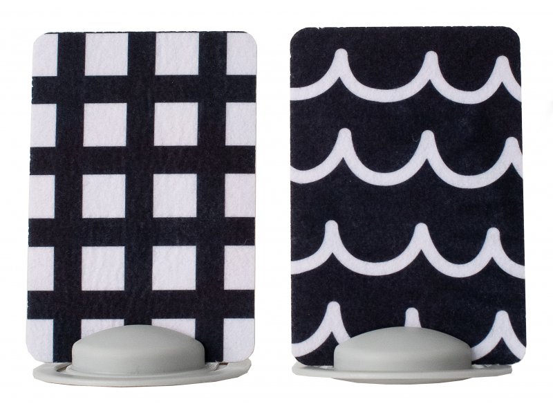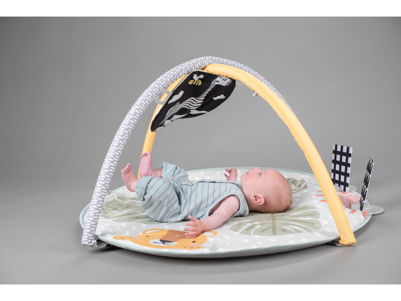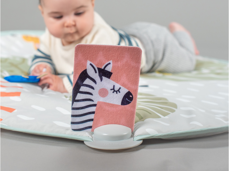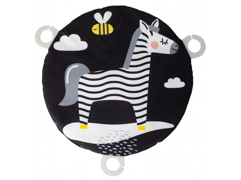 Originální odnímatelné hračky včetně oboustranného šusticího panelu upoutají pozornost dítěte a zajistí mu hodiny zábavy. Strana panelu s vysoce kontrastními černobílými ilustracemi je určena pro děti od narození do 3 měsíců, různobarevná strana je ideální pro děti od 3 měsíců. Panel je možné připevnit různými způsoby k dece i hrazdě a podněcovat tak hraní dítěte v různých polohách: