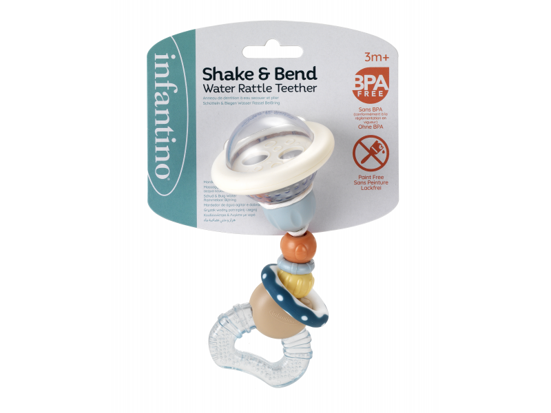 Chrastítko s kousátkem Infantino zaujme vaše miminko chrasticími barevnými korálky v průhledné kuličce i ohebnou konstrukcí s posuvnými korálky. Kousátko naplněné vodou je možné ochladit v lednici pro větší úlevu při prořezávání prvních zoubků.