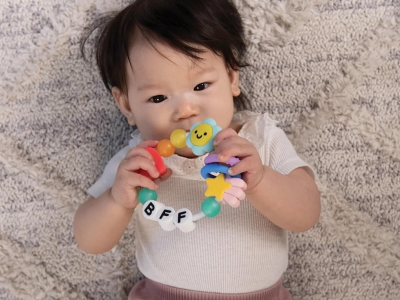 Krásné kousátko v podobě náramku je vyrobeno z pružného měkkého silikonu. Různorodé textury lákají dítě ke zkoumání v ústech, masírováním dásní kousátko pomáhá dítěti při prořezávání prvních zoubků.