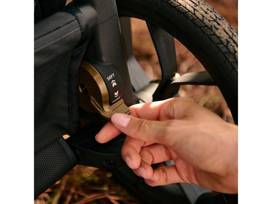 Patentované nezávisle nastavitelné odpružení každého kola. Děti rostou a cesty, kterými jedeme, jsou některé hladké, jiné hrbolaté. Proto vyvinula Inglesina nastavitelné odpružení. Pro miminko vážící 4–5 kg si odpružení přepnete na soft, a později, až už z něj bude batole vážící 12 kg, odpružení přepnete na hard. Kromě možnosti nastavit tuhost odpružení, zvětšila Inglesina jeho zdvih. Takže Aptica XT lépe překonává i větší nerovnosti cesty. Doporučení pro nastavení odpružení naleznete na konci přiloženého souboru.