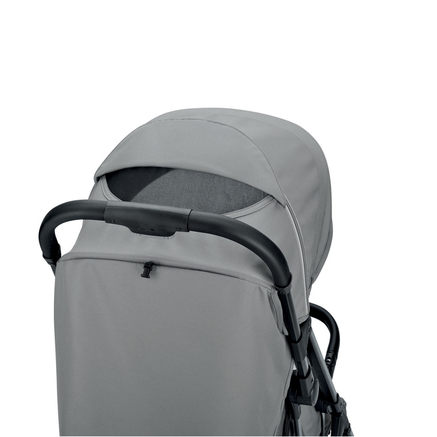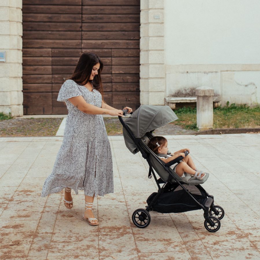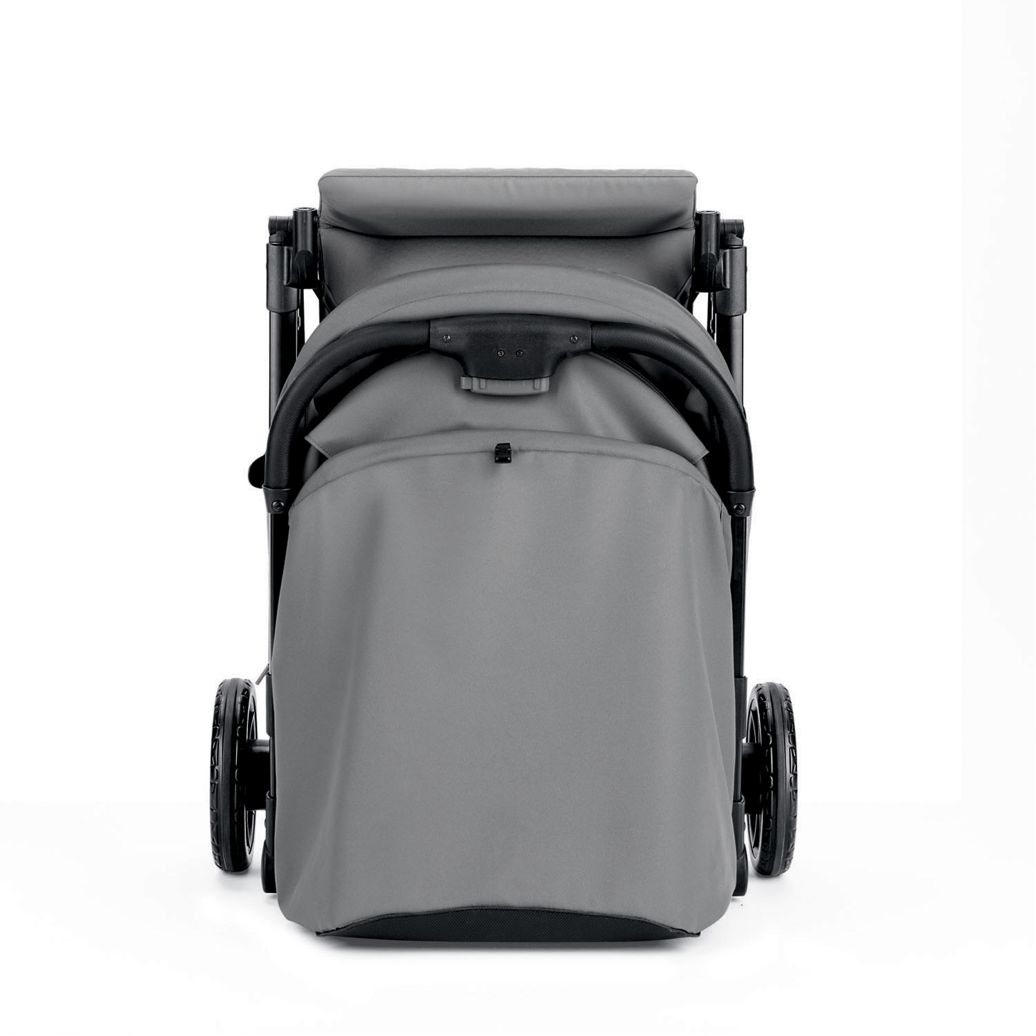 Speciální automatické skládání se aktivuje dotykem a v mžiku se kočárek sám složí. Po složení zůstane stát rukojeti vzhůru, takže ani rukojeť ani potah se nedotýkají země, proto všude zachováte maximální hygienu.