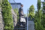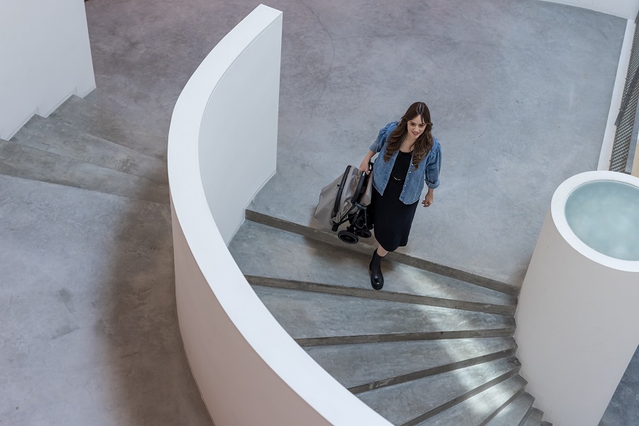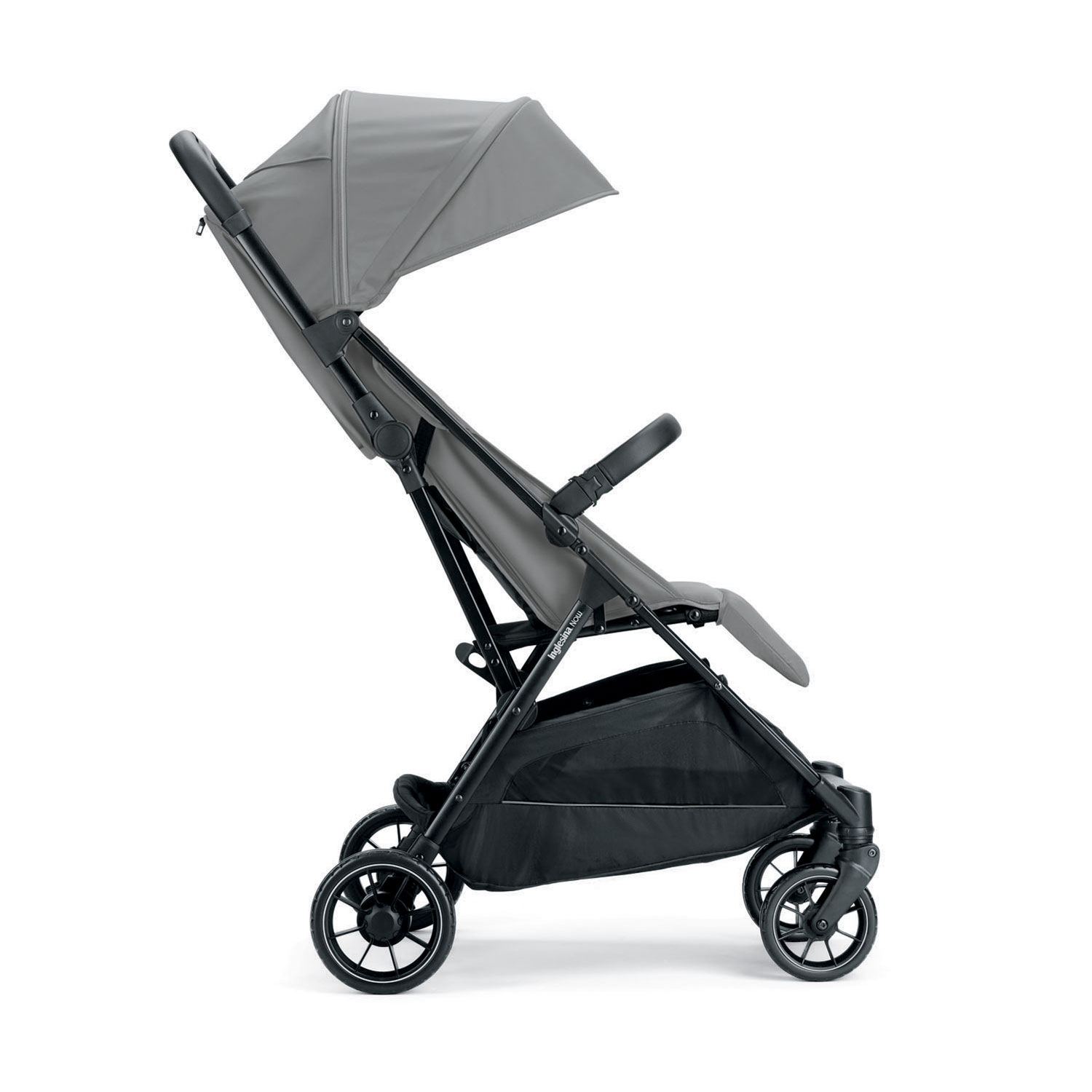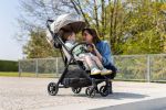 Speciální automatické skládání se aktivuje dotykem a v mžiku se kočárek sám složí. Po složení zůstane stát rukojeti vzhůru, takže ani rukojeť ani potah se nedotýkají země, proto všude zachováte maximální hygienu.