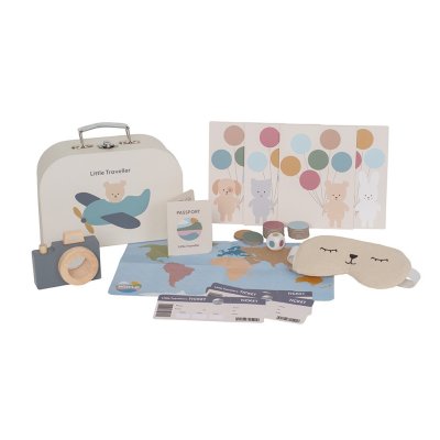 Cestovní sada „Malý cestovatel“ Ideální sada pro malé dobrodruhy, kteří si chtějí „zabalit“ na vlastní cestu Obsahuje vše potřebné pro zábavnou hru na cestování: pas, letenky, fotoaparát s prizmatem, mapa a další doplňky Hra s balónky podporuje logické myšlení, barvy a koordinaci ruky a oka Součástí je maska na spaní pro odpočinek během „dlouhých cest“ Děti se učí plánovat cestu, objevovat nové věci a rozvíjejí představivost Skvělá kombinace hry na role a interaktivní zábavy Vyrobeno z kvalitních a bezpečných materiálů vhodných pro děti Bezpečné provedení dle evropských norem Technické parametry Doporučený věk: od 3 let Materiál: bukové dřevo, teakové dřevo, karton, bavlna Rozměry produktu: 15 × 20 × 7 cm Obsah balení: cestovní taška „Malý cestovatel“, pas, 3 letenky, dřevěný fotoaparát s prizmatem, látková maska na spaní, mapa světa, cestovní hra s 4 herními políčky a 24 balónky, kostka Certifikace: splňuje evropské bezpečnostní normy EN Bezpečnost: testováno dle EU standardů, používání pod dohledem dospělé osoby