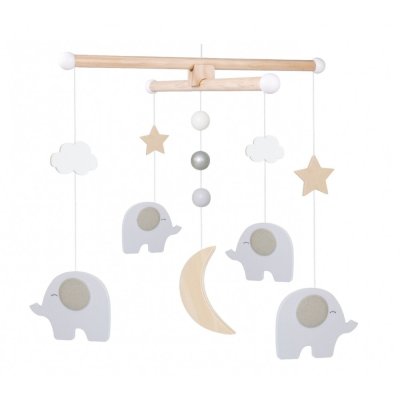 Kolotoč slon Roztomilý dřevěný kolotoč pro zavěšení nad postýlku Stimuluje smysly dítěte a podporuje jeho pohybové schopnosti Pomáhá uklidnit dítě před odpočinkem Ideální doplněk do dětského pokoje Technické parametry Rozměry: 32 × 32 × 32 cm Doporučený věk: od narození Bezpečnost: používání pod dohledem dospělých