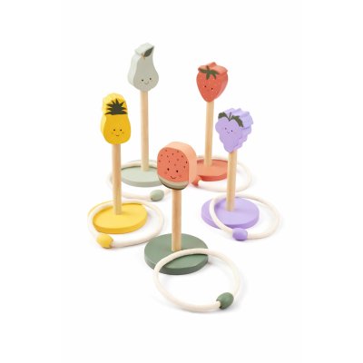 Hra Házení kroužků Hravá hra na házení kroužků rozvíjející přesnost, koordinaci a motoriku Cíle jsou roztomilé dřevěné figurky ovoce: borůvka, meloun, jahoda, hruška a ananas Perfektní pro soutěživé hry a spoustu smíchu venku i doma Obsahuje 5 dřevěných figur a 5 házecích kroužků Vyrobeno z kvalitního FSC™ certifikovaného dřeva Technické parametry Doporučený věk: od 3 let Rozměry produktu: 26 × 31 × 10,5 cm Materiál: MDF, teakové dřevo, bavlna Bezpečnost: testováno dle evropských standardů, používání pod dohledem dospělé osoby