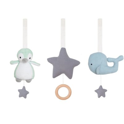 Textilní hračky na hrazdičku Roztomilé a měkké postavičky – hvězda s ukolébavkou, tučňák a velryba s chrastítkem Snadné připevnění a přesunutí mezi různými hrazdičkami, baby gymy nebo postýlkami díky poutkům Podporují vizuální vnímání, jemnou motoriku a zábavu během hraní Ideální doplněk k dřevěným hrazdám a postýlkám Technické parametry Doporučený věk: 0+ Rozměry produktu: cca 21 × 35 × 5 cm Materiál: polyester, bavlna, dřevo Údržba: ruční praní Bezpečnost: testováno dle evropských standardů, používání pod dohledem dospělé osoby