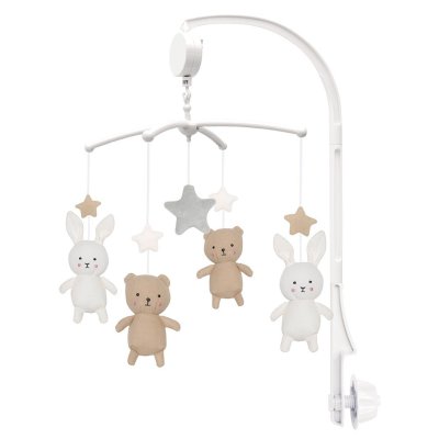 Hudební kolotoč nad postýlku Roztomilý hudební kolotoč k zavěšení nad postýlku nebo přebalovací pult Hudební skříňka s natahovacím mechanismem hraje uklidňující melodii (ukolébavku), zatímco se postavičky pomalu otáčí Barevné tvary a pohybující se figury stimulují vizuální vnímání a sluch dítěte Bezpečný a uklidňující doplněk, který podporuje soustředěnou hru a relaxaci Technické parametry Doporučený věk: 0+ Rozměry produktu: cca 36 × 27,5 × 7,5 cm Materiál: 100 % bavlna (textil), mechanismus hudební skříňky z plastu a dřeva Bezpečnost: testováno dle evropských standardů, používání pod dohledem dospělé osoby