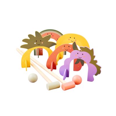 Zahradní kroket – zábava a pohyb pro děti Barevné figurky ve tvaru ovoce – ananas, meloun, jahoda, borůvka a mango Podporuje koordinaci, pohyb a zábavu při hře s kamarády a rodinou Obsahuje 5 barevných dřevěných kuželů, 2 pálky a 2 koule Vyrobeno z FSC™ certifikovaného dřeva, odolné a bezpečné pro děti Technické parametry Doporučený věk: 3+ Rozměry produktu: 22,5 × 60,8 × 5,5 cm Materiál: překližka, dřevo Bezpečnost: testováno dle evropských standardů, používání pod dohledem dospělé osoby