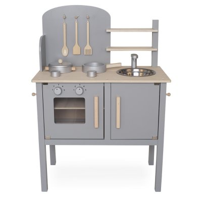 Dětská kuchyňka Skvělá dětská kuchyňka pro všechny malé kuchaře a milovníky vaření Obsahuje spoustu hravých detailů: dřez, sporák, troubu, stejně jako hrnec, pánev a tři kuchyňské nástroje Zadní část sporáku má tabuli, na kterou lze napsat, co je k večeři Kuchyňka má skříňky a dvě police pro uložení všech kuchyňských doplňků Dveře kuchyňky lze otevřít, na sporáku jsou 2 plotýnky s regulovatelnými knoflíky Háčky na stěně umožňují zavěsit kuchyňské náčiní, součástí jsou i dva hrnce Podporuje představivost, kreativitu a role-play hru Bezpečné provedení z kvalitního dřeva dle evropských norem Technické parametry Doporučený věk: od 3 let Materiál: překližka, MDF, bukové dřevo, teakové dřevo, borovicové dřevo Rozměry produktu: 57,5 × 60,5 × 9 cm Obsah balení: dětská kuchyňka, hrnec, pánev, 3 kuchyňské nástroje Certifikace: splňuje evropské bezpečnostní normy EN Bezpečnost: testováno dle EU standardů, používání pod dohledem dospělých