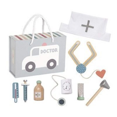 Dětská lékařská sada Kompletní lékařská sada pro malé doktory – zahrnuje všechny základní nástroje pro péči o rodinu, přátele i mazlíčky Podporuje kreativní hru, empatii a rozvoj sociálních dovedností Lékařská taška s praktickým úložným prostorem, snadno přenositelná Vyrobeno z FSC™-certifikovaného dřeva (FSC™C194598) Obsah sady: 1× injekční stříkačka 1× dřevěný stetoskop 1× teploměr 1× mast 1× tlakoměr 1× lékařská čepice 1× lahvička s léky 1× otoskop (přístroj pro vyšetření očí a uší) Technické parametry Doporučený věk: 18m+ Rozměry produktu: 14 × 20 × 7,5 cm Materiál: překližka, MDF, teakové dřevo, polyester, plast, papírová krabička Bezpečnost: testováno dle evropských standardů, používání pod dohledem dospělé osoby