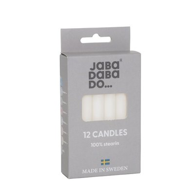 Jabadabado – Bílé svíčky do svícnu Elegantní bílé svíčky vhodné pro všechny narozeninové svícny Jabadabado Vyrobeny ze 100% stearinu pro čisté a stabilní hoření Praktické balení obsahuje 12 kusů Vyrobeno ve Švédsku Technické parametry Rozměry produktu: cca 14 × 7,5 × 2,5 cm Materiál: 100 % stearin Bezpečnost: testováno dle evropských standardů, používání pod dohledem dospělé osoby.