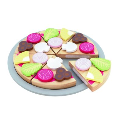 Dřevěná pizza se všemi ingrediencemi Přináší zábavu a kreativitu do každé dětské kuchyňky Podporuje rozvoj jemné motoriky a představivosti při hraní rolí Jednoduché spojování a oddělování kousků pizzy pomocí suchého zipu Obsah balení 6 dílů pizzy spojených suchým zipem 3 houby, 3 plátky salámu, 3 cibulové kroužky 3 listy salátu, 3 kousky ananasu, 3 olivy Pizza kráječ Pizza talíř Pizza krabice Technické parametry Rozměry produktu: 4×28×23 cm Materiál: borové dřevo, MDF Vhodné pro děti od 2 let Bezpečnost: testováno podle evropských norem, pod dohledem dospělého