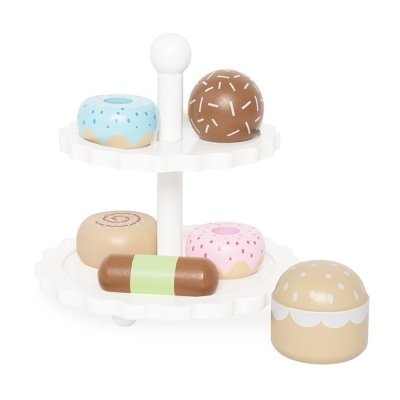 Dvoupatrový podnos s cukrovinkami Roztomilý dvoupatrový dřevěný podnos plný 6 lahodných sušenek. Skvělý doplněk pro hru na kavárnu, kde děti mohou hostům servírovat sladkosti. Podporuje kreativní hru, rozvoj představivosti a jemné motoriky. Sada obsahuje: 1 dvoupatrový podnos, 6 dřevěných sušenek Technické parametry Materiál: jalovcové dřevo, MDF Vhodné pro děti od 3 let Rozměry produktu: 16,5 × 17 × 16 cm