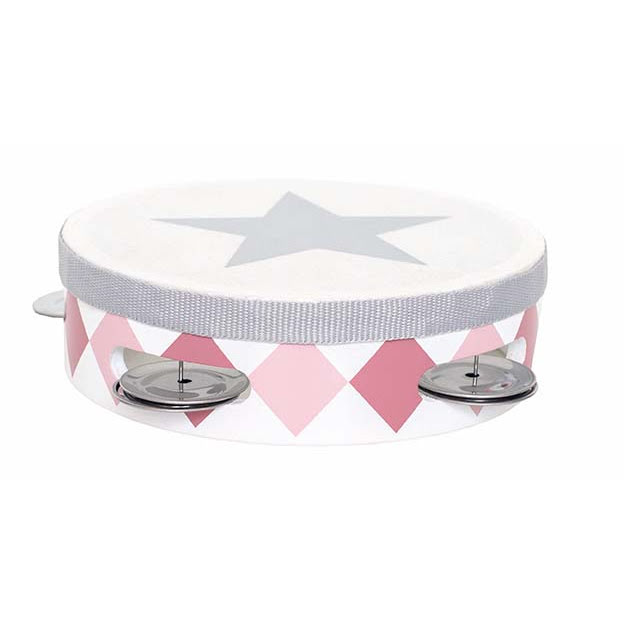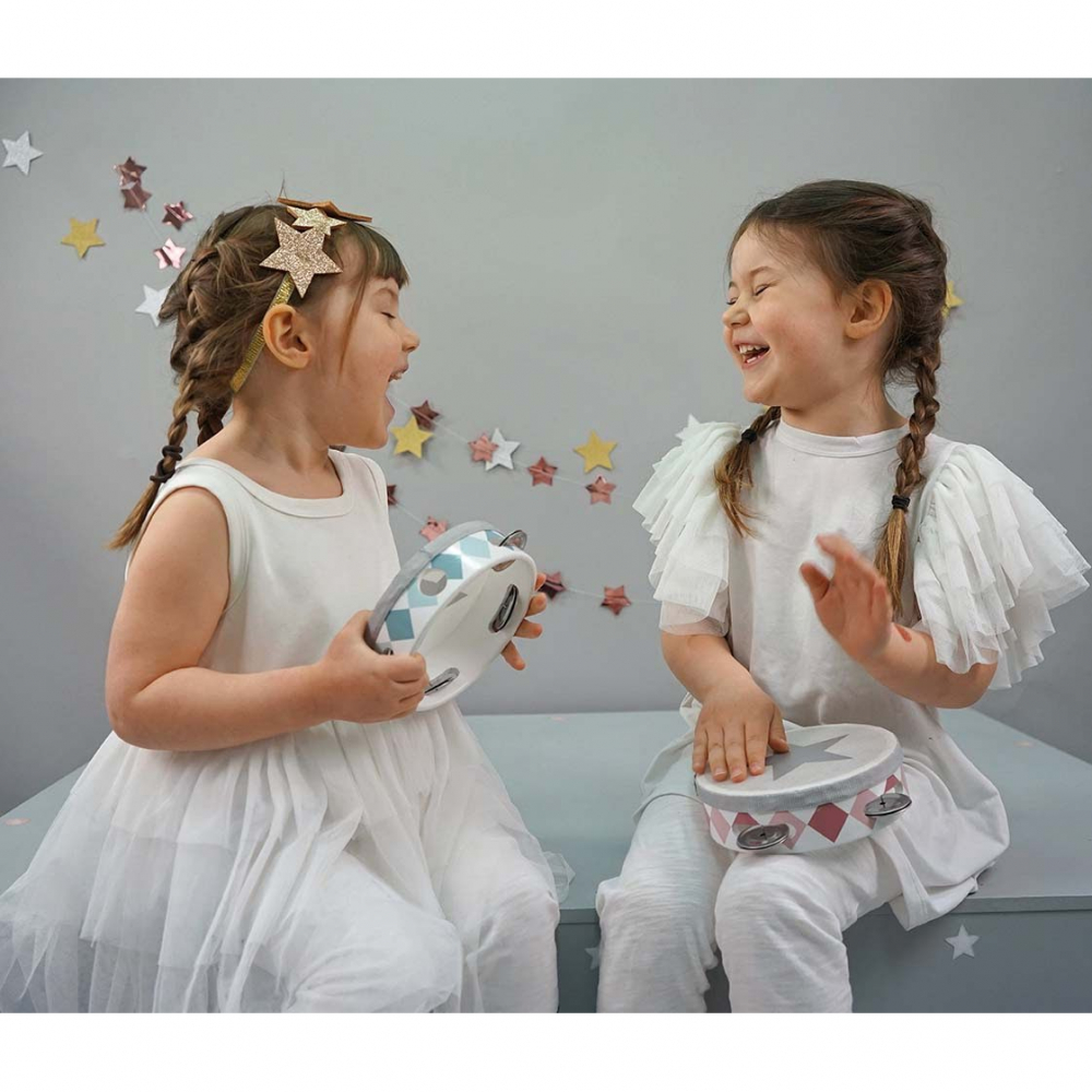 Stylový hudební nástroj pro malé hudebníky. Dva nástroje v jednom – bubínek i tamburína. Zároveň je tamburína krásný doplněk do pokojíčku.