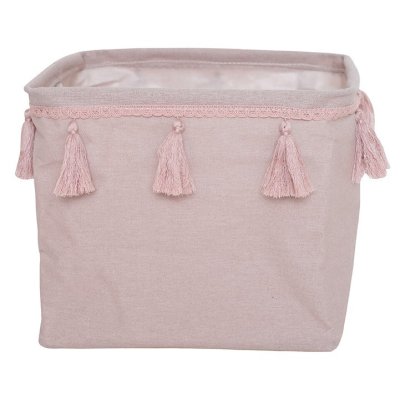 Úložný košík Stylový a praktický košík na hračky, šály, čepice nebo jiné dětské věci Voskovaná vnitřní strana, díky které si košík udržuje tvar i prázdný Třásně po obvodu Vyroben z částečně recyklovaného materiálu Technické parametry Materiál: 35 % polyester, 65 % bavlna Rozměry: 29 × 29 cm Vhodné pro děti od narození Testováno dle evropských bezpečnostních norem, bezpečné pro děti pod dohledem dospělého