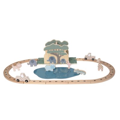 Dřevěná safari dráha Vydejte se na dobrodružnou cestu do srdce savany Dřevěná dráha s vláčkem, zvířátky a přírodními dekoracemi podporuje kreativní hru, vyprávění příběhů a představivost Obsahuje lva, žirafu, slona a další divoká zvířata Trasa vede kolem velkého stromu a přes napajedlo, kde se zvířata zastavují Figury a vlak jsou navrženy pro malé ručky, ideální pro jemnou motoriku Odolné dřevo a harmonické barvy vhodné pro děti i dospělé Vhodné pro domácí hraní i jako dekorace dětského pokoje Technické parametry Doporučený věk: od 2 let Materiál: překližka, MDF, teakové dřevo, bukové dřevo Rozměry produktu: 20 × 28,5 × 16,5 cm Bezpečnost: používání pod dohledem dospělých, testováno dle evropských norem