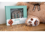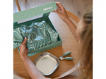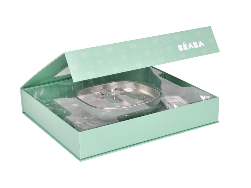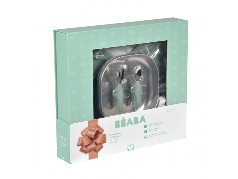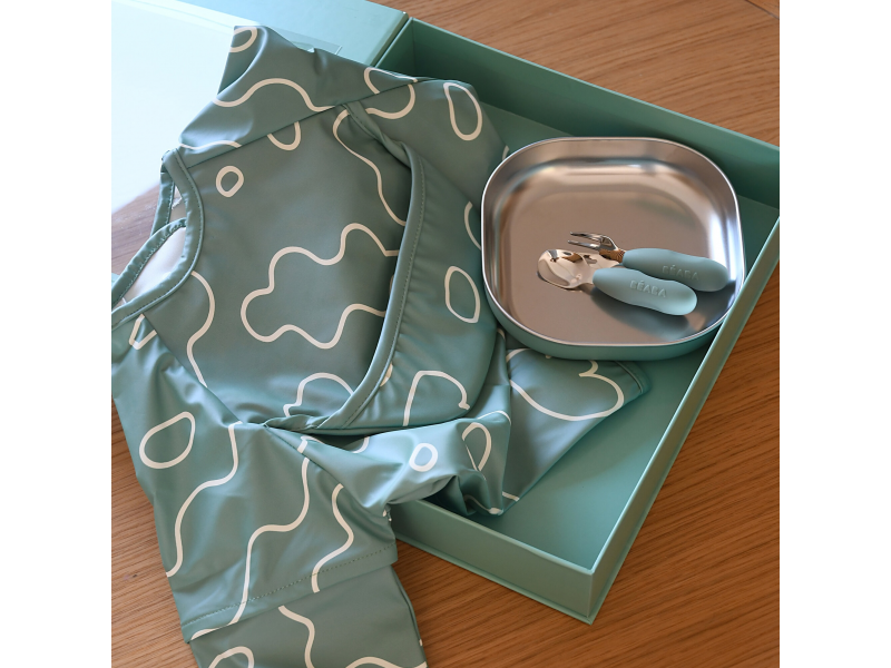 Jídelní sadu pro nejmenší tvoří nerezový talíř se silikonovou povrchovou vrstvou, ergonomická tréninková lžička a vidlička a bryndák s odepínacími rukávy a kapsou na drobky. Krásnou krabičku, ve které je sada zabalená můžete používat i jako krabičku na drobnosti.