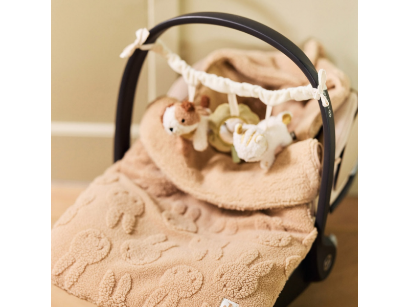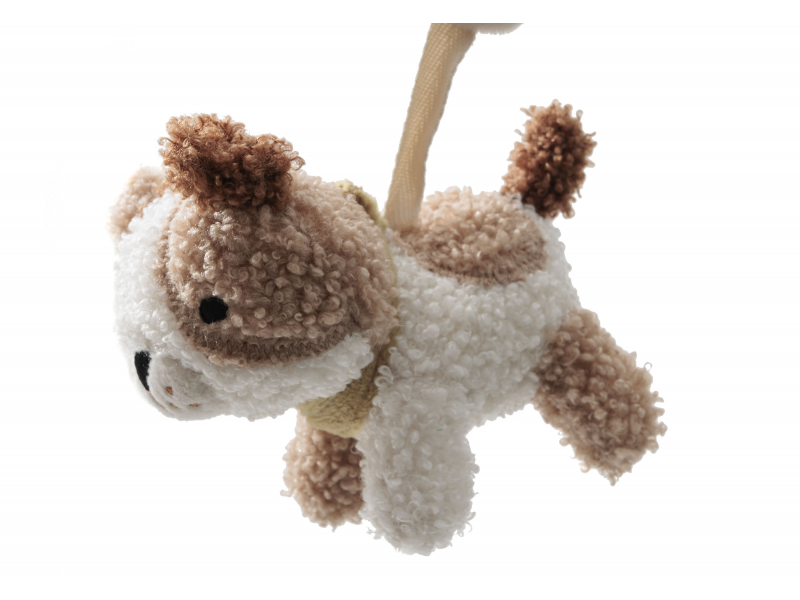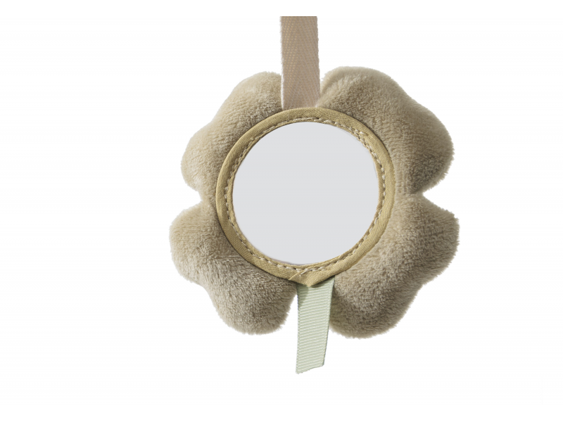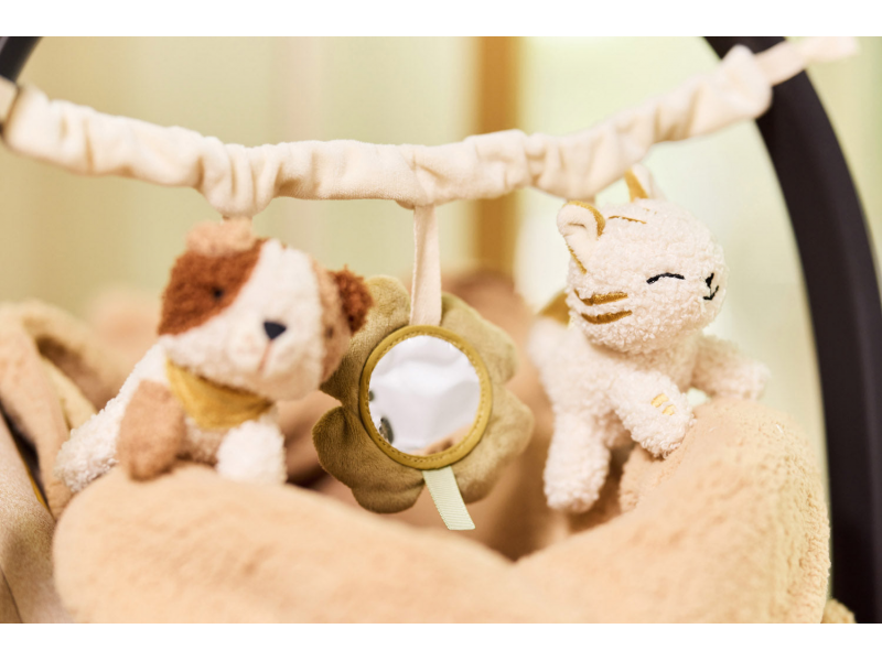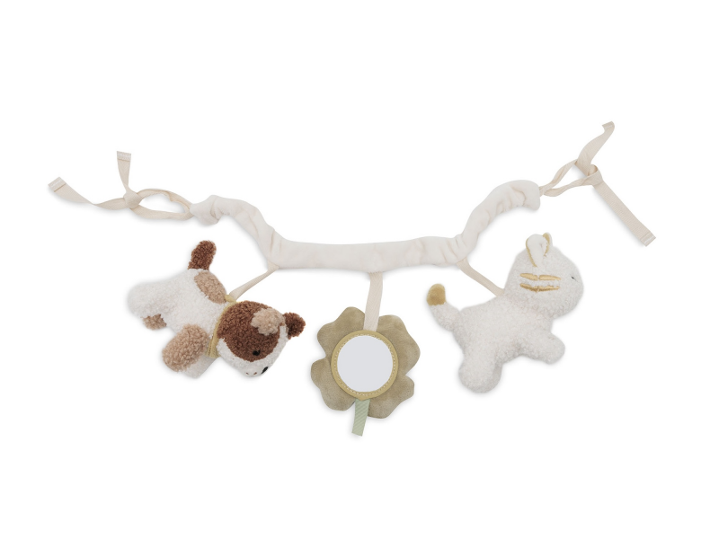 Řetěz na kočárek či autosedačku se zavěšenými hračkami v podobě pejska, kočičky a čtyřlístku s bezpečným zrcátkem zabaví vaše miminko v kočárku či autosedačce. Měkké hračky vyrobené z jemného plyše cinkají a nabízí různé textury pro zkoumání. Hračky stimulují koordinaci ruka / oko dítěte.