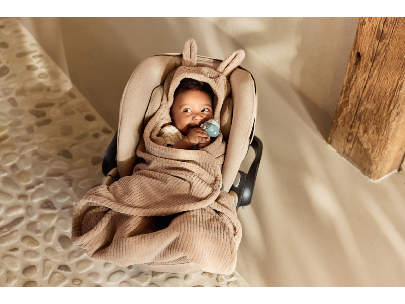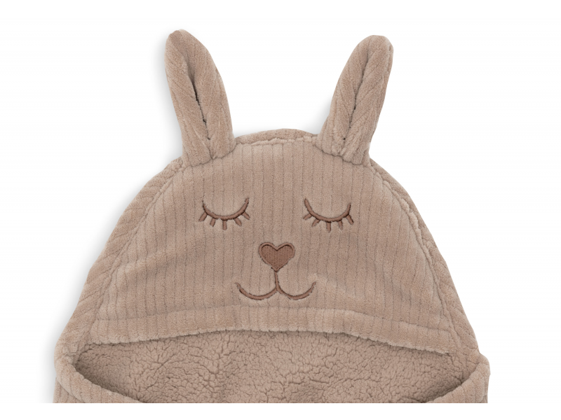 Zavinovačka z měkké žebrované textilie s plyšovou podšívkou umožňuje snadno a rychle miminko zabalit a zajistit mu pocit bezpečí, tepla a pohodlí. Kapuce zajistí teplo na hlavičku i při spaní dítěte v chladnějším prostředí. Zavinovačka se zapíná s pomocí suchých zipů.