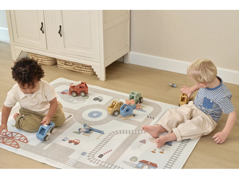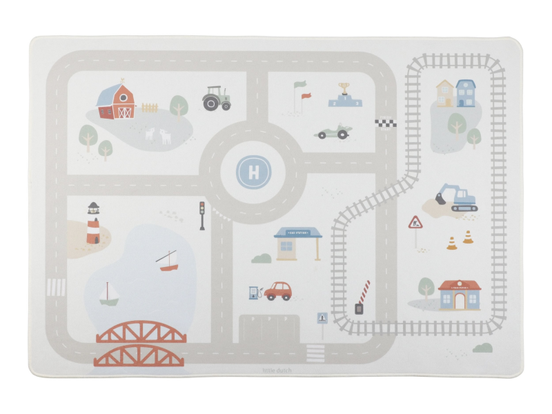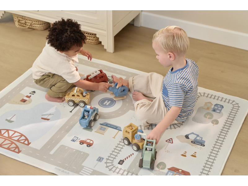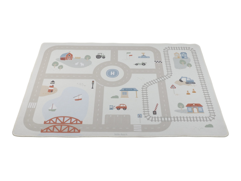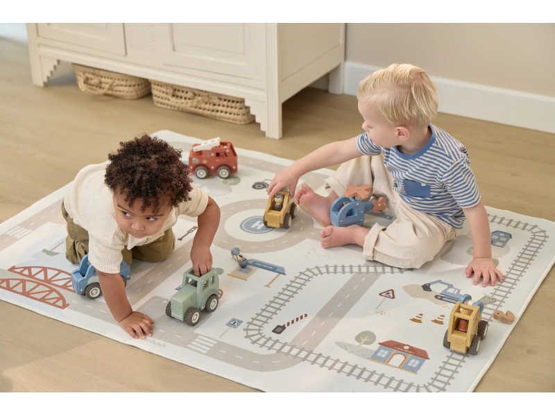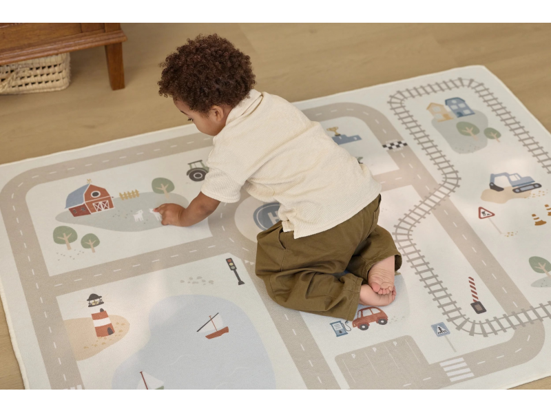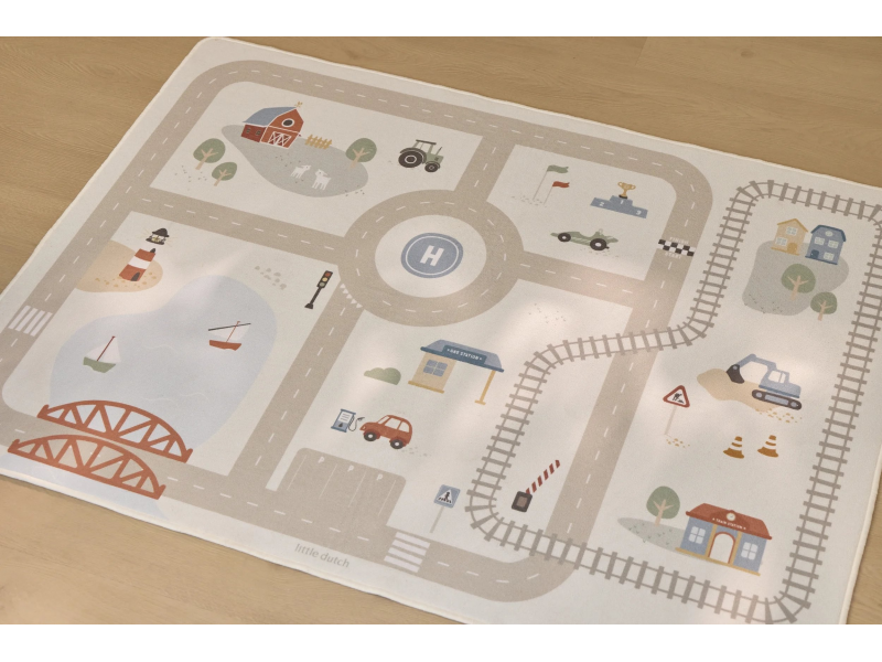 Dětský koberec Little Dutch promění podlahu v dětském pokoji v živý svět plný silnic, zatáček a křižovatek, kde se příběhy tvoří samy. Děti mohou parkovat auta do garáže, projíždět městem nebo se vydat na cestu vlakem – design koberce je přirozeně vede a podporuje fantazii i soustředěnou hru. Koberec bude skvělým doplňkem při hraní s autíčky, vláčky, stavebnicemi nebo dalšími hračkami.