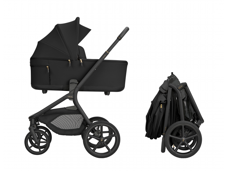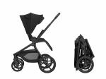 Po složení kočárek samostatně stojí. Pro snadné přenášení je připravený popruh přes rameno a madlo.