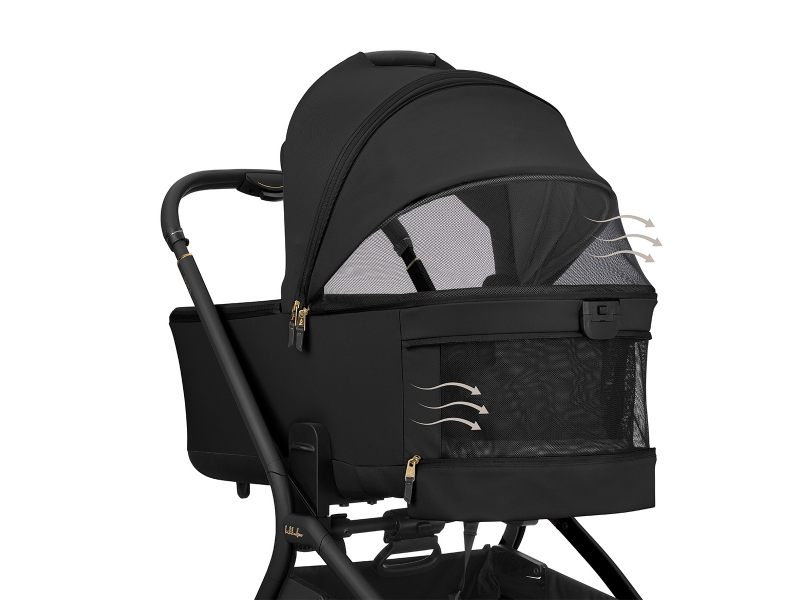 Pro pohodlí dítěte je součástí oboustranná měkká matrace se zimní stranou z kvalitního sametového materiálu a letní stranou z prodyšné síťoviny pro lepší ventilaci. Stříška má zipové prodloužení, sluneční clonu a doplňuje ji extra sluneční clona pro maximální stín. Ventilaci zajišťují síťované větrací otvory na stříšce i v oblasti hlavy. Praktická je i kapsa na telefon na zip. Voděodolný textilní materiál s UPF 50+ chrání dítě před povětrnostními vlivy a slunečním zářením.