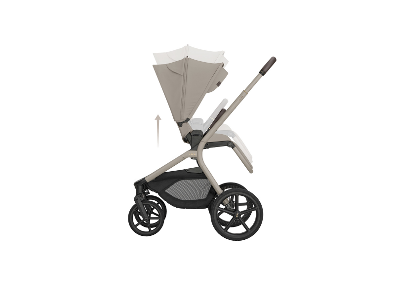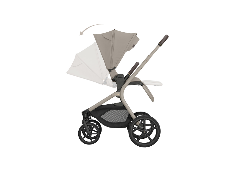 Sportovní sezení je možné nasadit po i proti směru jízdy a díky tlačítkům s pamětí ho uvolníte z podvozku pohodlně jednou rukou. Výšku sezení můžete nastavit do dvou poloh pro přizpůsobení kočárku podle výšky rodiče. Odnímatelné madlo před dítětem je otočné o 360° pro snadnou manipulaci s dítětem a potažené příjemnou ekokůží.